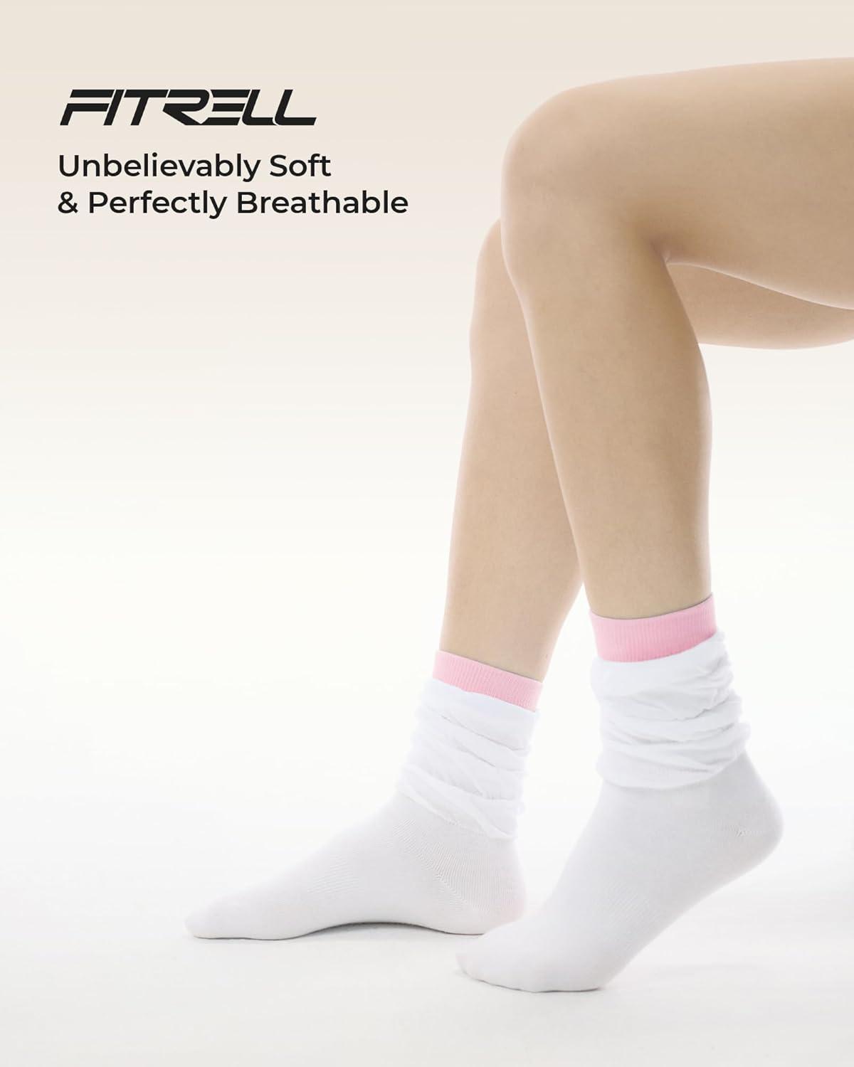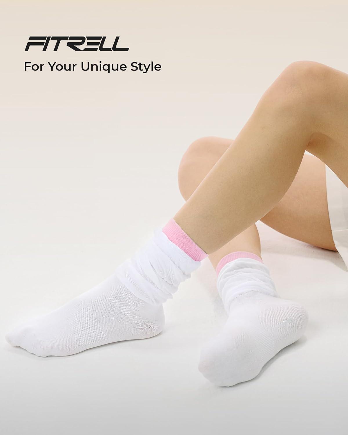 FITRELL Slouch Crew Socks for Women, Pre-sewn Slouch Look Soft Cotton Mid Calf Retro Cute Socks 3 Pairs (Can’t Straighten)(White Pink+white Blue+white Green)