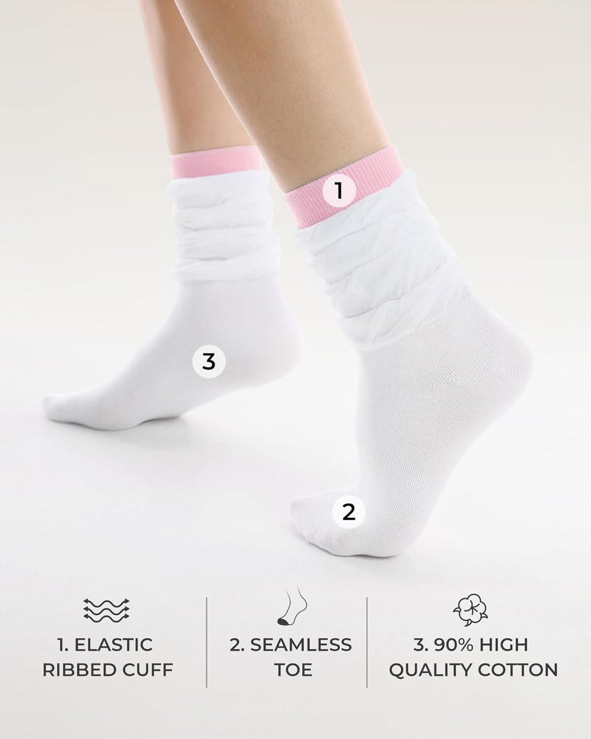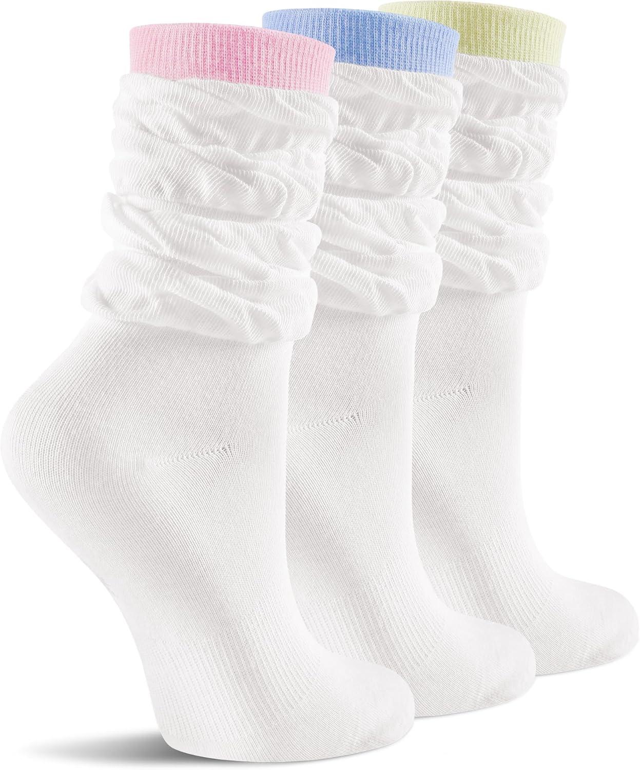 FITRELL Slouch Crew Socks for Women, Pre-sewn Slouch Look Soft Cotton Mid Calf Retro Cute Socks 3 Pairs (Can't Straighten)(White Pink+white Blue+white Green)